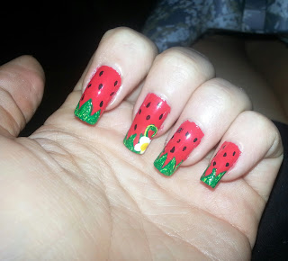 these got messed up. only lasted for about a day. i did a photo shoot in water and they got all chipped climbing over rocks and such. and of course, the top coat smeared since i didnt wait long enough for the red to dry. it was an out the door jobie that i did to match the colors i was wearing for the shoot.